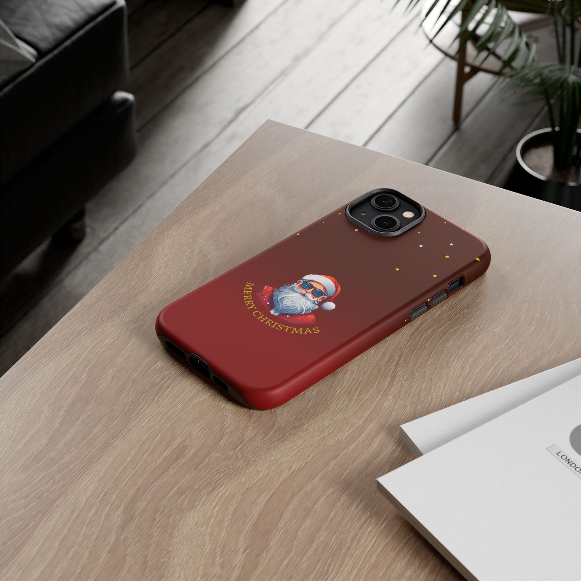 A slim, dual-layer protective phone case that brings a warm, festive mood to your everyday carry. The deep red gradient background fades into a gentle night-sky speckled with tiny golden lights, centering a modern Santa illustration wearing sunglasses and a fluffy hat. The image is printed with full 3D wrap and high ink density for vivid color and smooth coverage. The TPU silicone liner cushions against drops while the hard polycarbonate shell resists impacts and scratches. Finished in your choice of glossy or matte, this case keeps ports accessible and supports wireless charging so the phone stays ready for holiday photos and playlists.