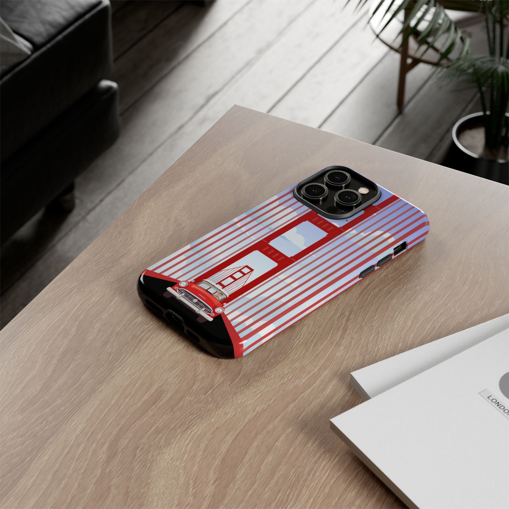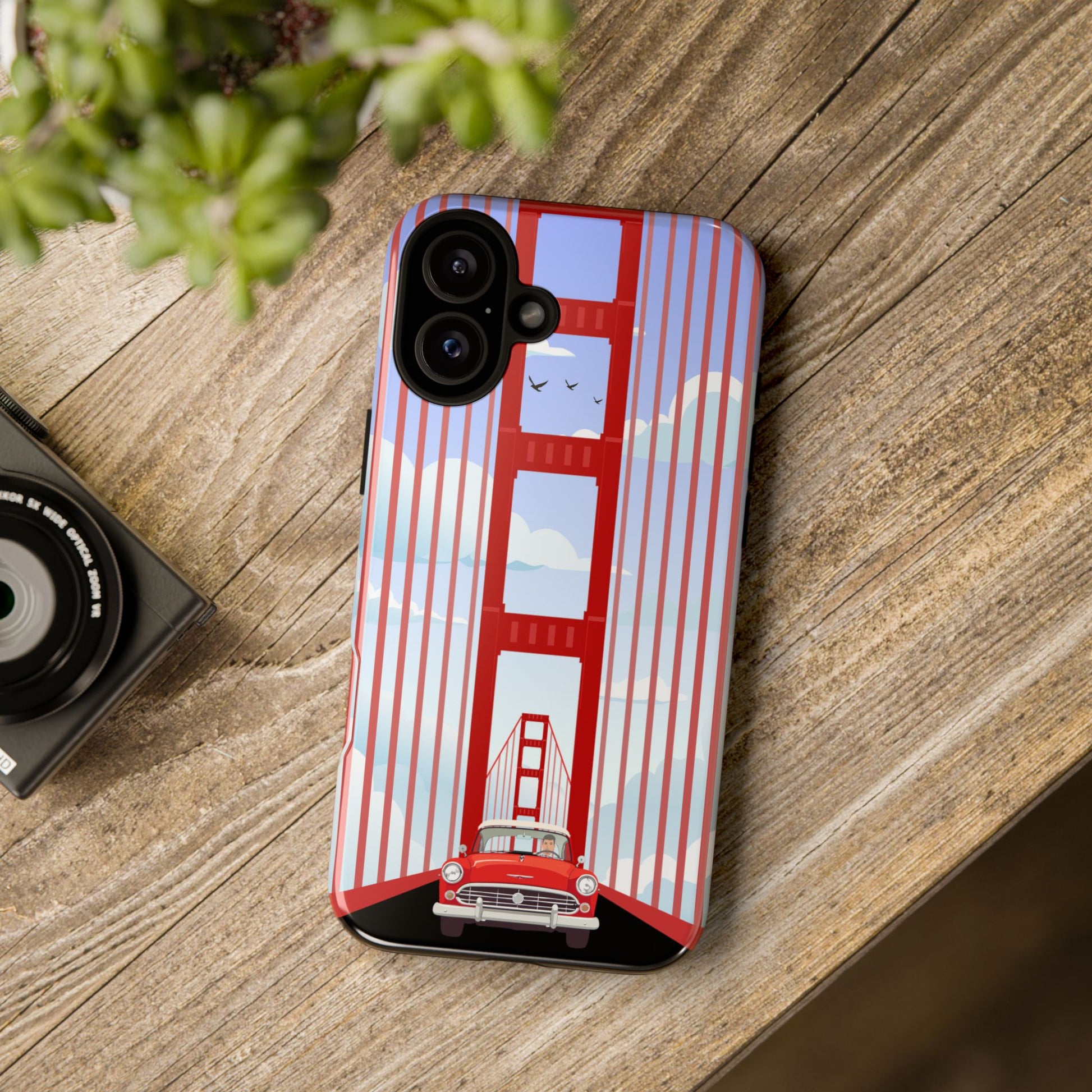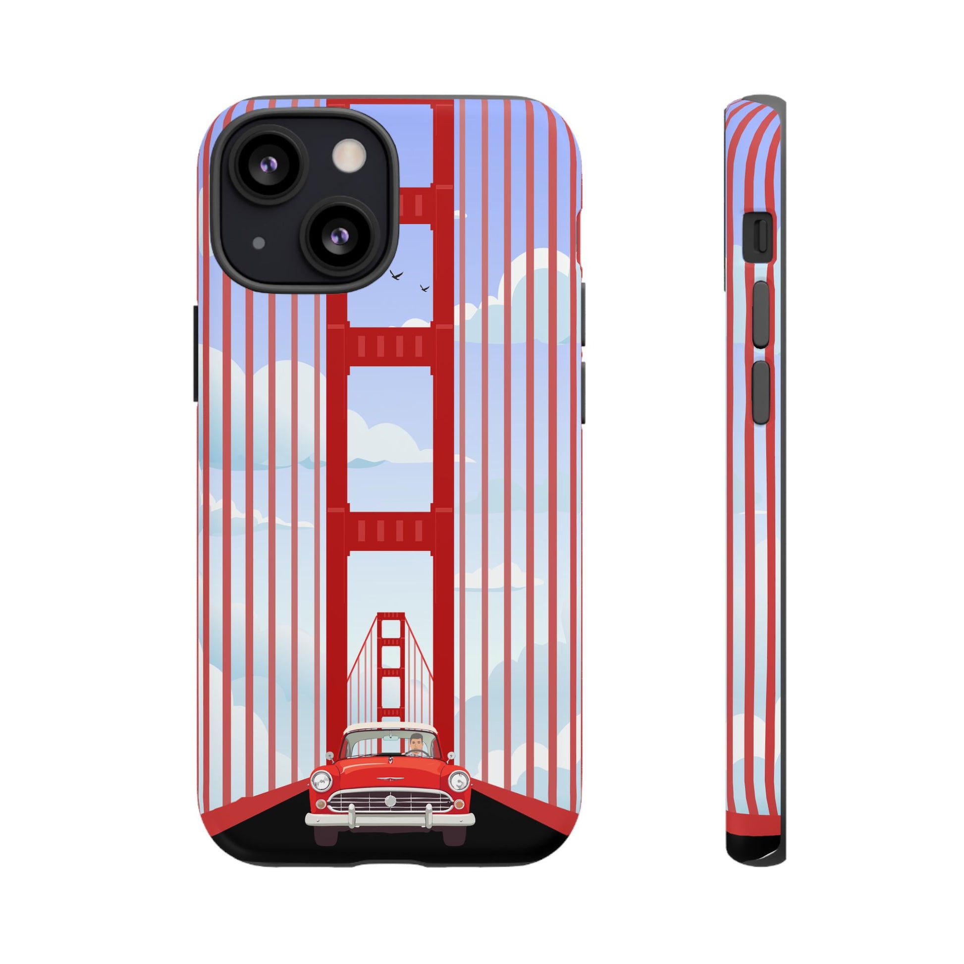 A slim, dual-layer protective phone case featuring a vibrant 3D-wrap print of a vintage red car crossing a span of a famous red suspension bridge under a bright blue sky. The glossy/matte finish options showcase high ink density and UV protection so the colors stay crisp outdoors. Inside, a soft TPU silicone liner cushions impacts while the rigid polycarbonate shell resists drops and tears. Ports remain fully accessible and wireless charging works without removing the case. This case blends retro road-trip charm with everyday durability — a tactile, travel-inspired accessory that keeps your phone safe and styled.