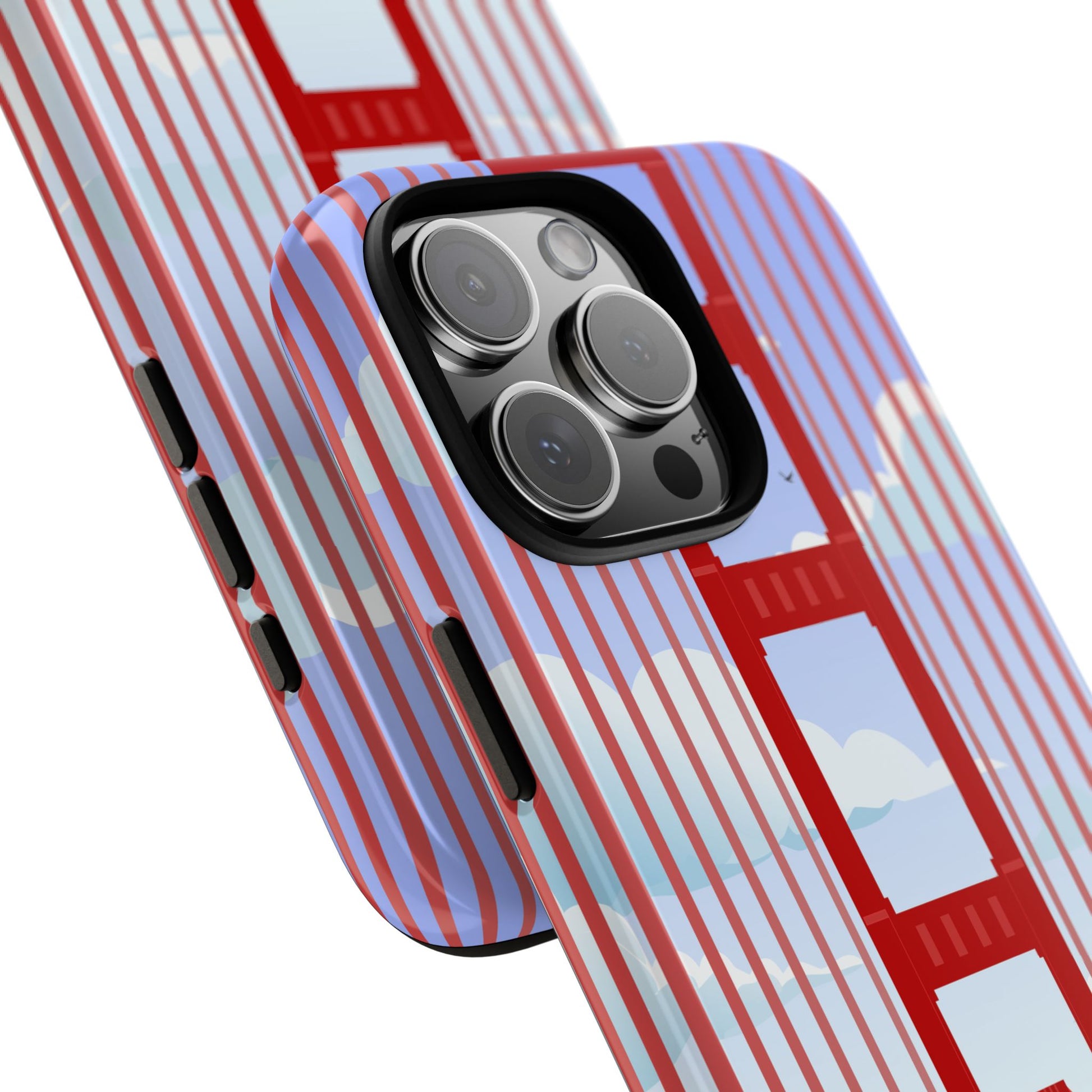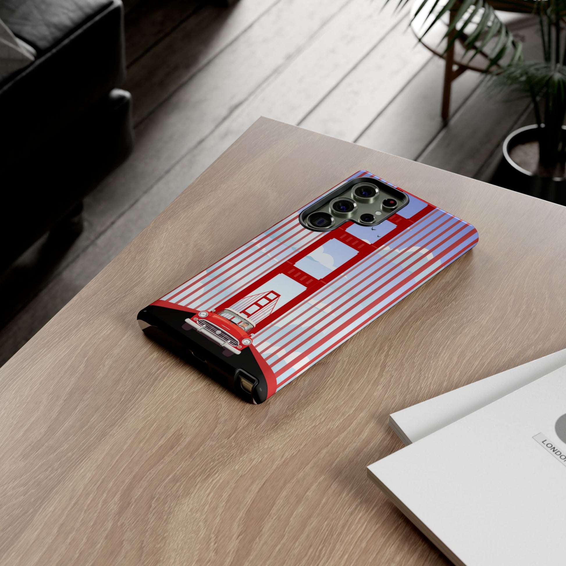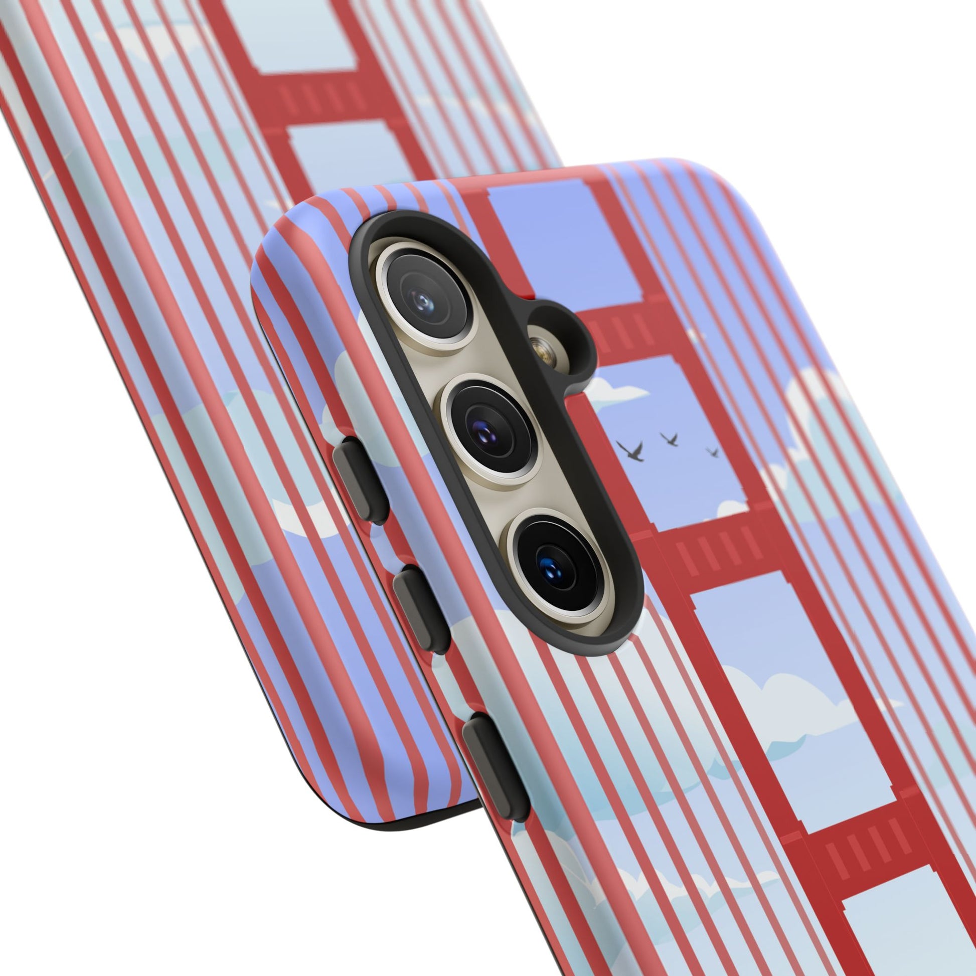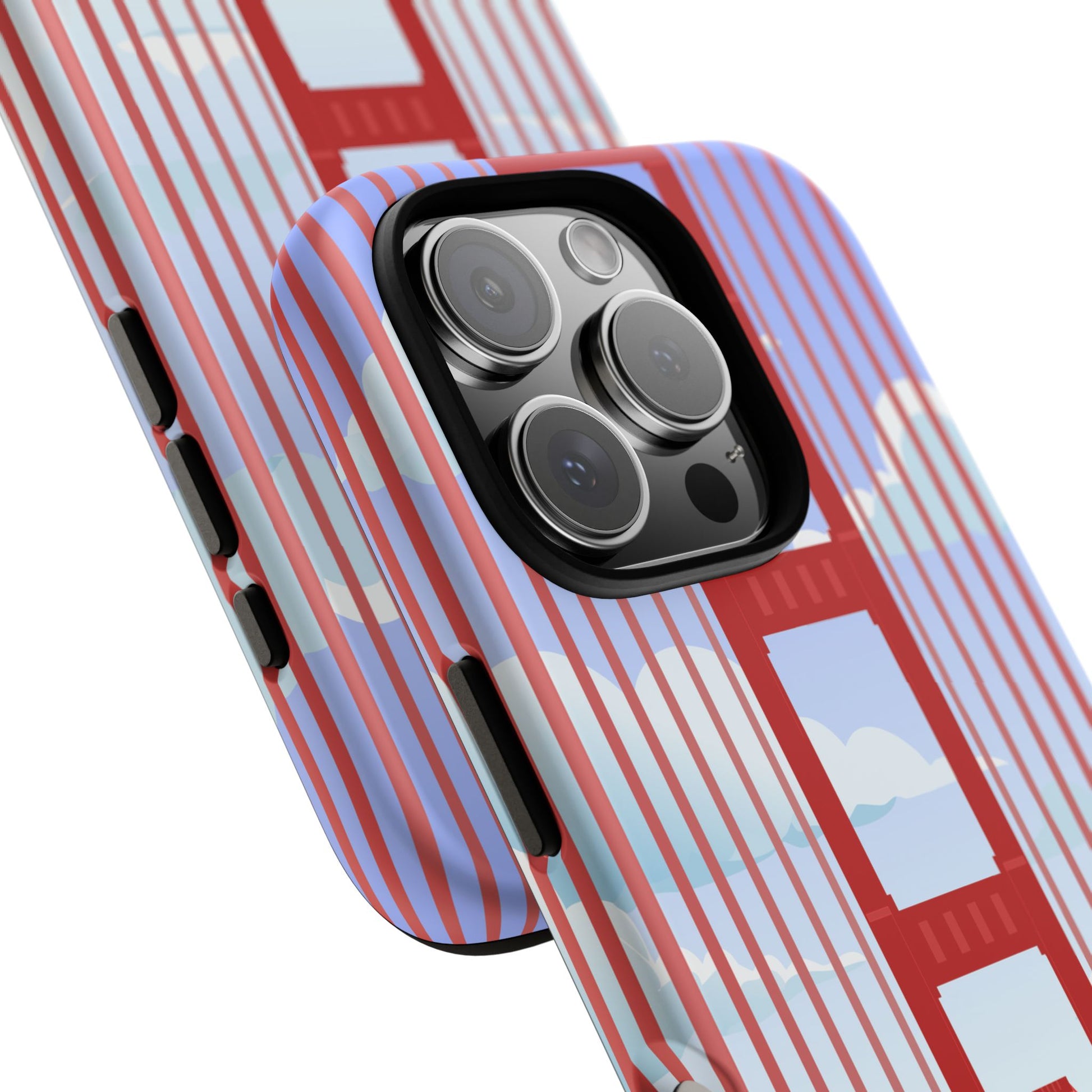 A slim, dual-layer protective phone case featuring a vibrant 3D-wrap print of a vintage red car crossing a span of a famous red suspension bridge under a bright blue sky. The glossy/matte finish options showcase high ink density and UV protection so the colors stay crisp outdoors. Inside, a soft TPU silicone liner cushions impacts while the rigid polycarbonate shell resists drops and tears. Ports remain fully accessible and wireless charging works without removing the case. This case blends retro road-trip charm with everyday durability — a tactile, travel-inspired accessory that keeps your phone safe and styled.