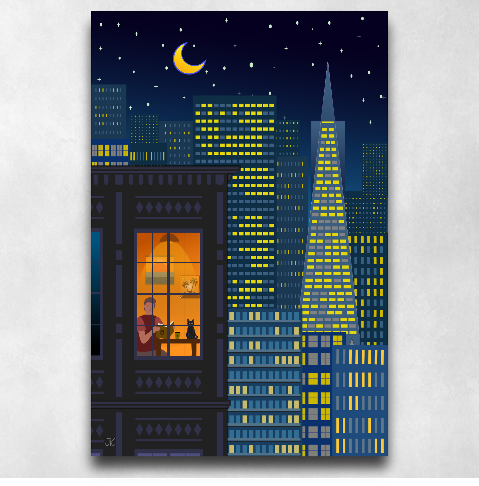Capture the peaceful, cozy vibes of a late night in the City by the Bay. This atmospheric digital illustration features a warm, glowing window overlooking the iconic San Francisco skyline, including the unmistakable silhouette of the Transamerica Pyramid. Inside, a person enjoys a quiet moment reading with their black cat, while a crescent moon hangs over the glittering urban lights. Perfect for fans of lo-fi hip hop aesthetics, night owls, and San Francisco locals.